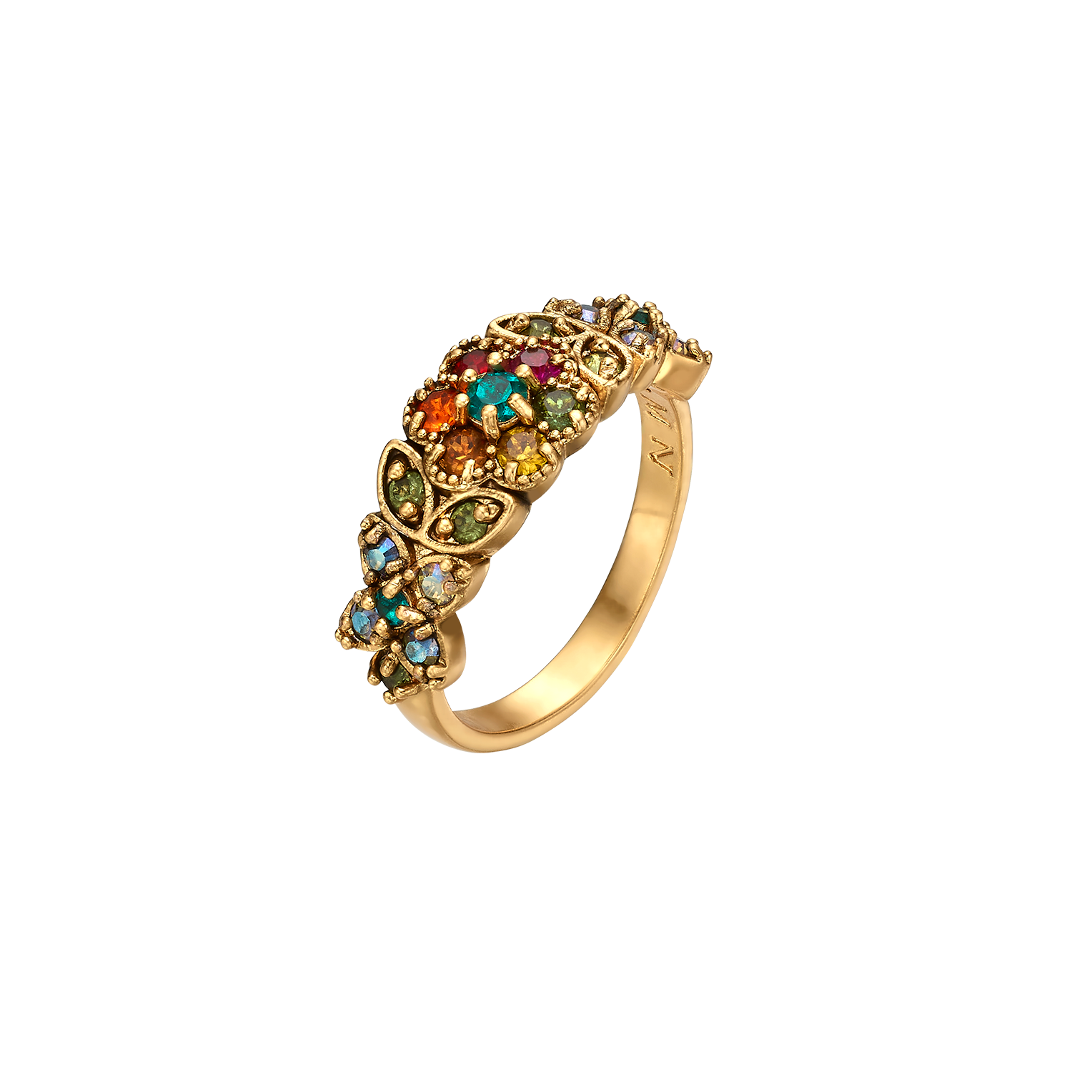 A floral ring in 18K antique gold plating, set with zircon stones in a combination of shades carefully selected by Michal and meticulously handcrafted. The ring, in a vintage jewelry style that is very much associated with Michal Negrin, is a perfect solution for a gift for a woman, a wedding anniversary gift or a birthday gift.