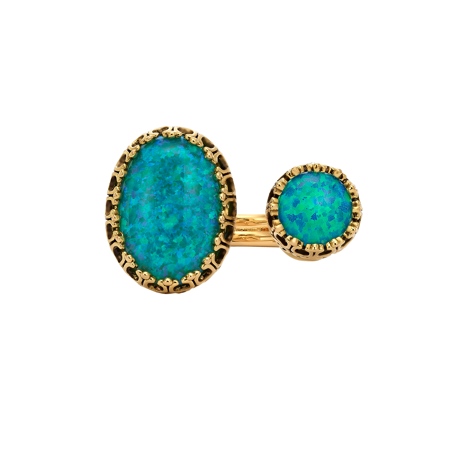 A duet ring set with a pair of oval synthetic opal stones in 18K antique gold plating. The ring was prepared through a meticulous goldsmithing process, made entirely by hand, with care for sparkle, light refraction and natural movement. The ring is the perfect solution for a birthday gift, wedding anniversary gift or Women's Day gift.