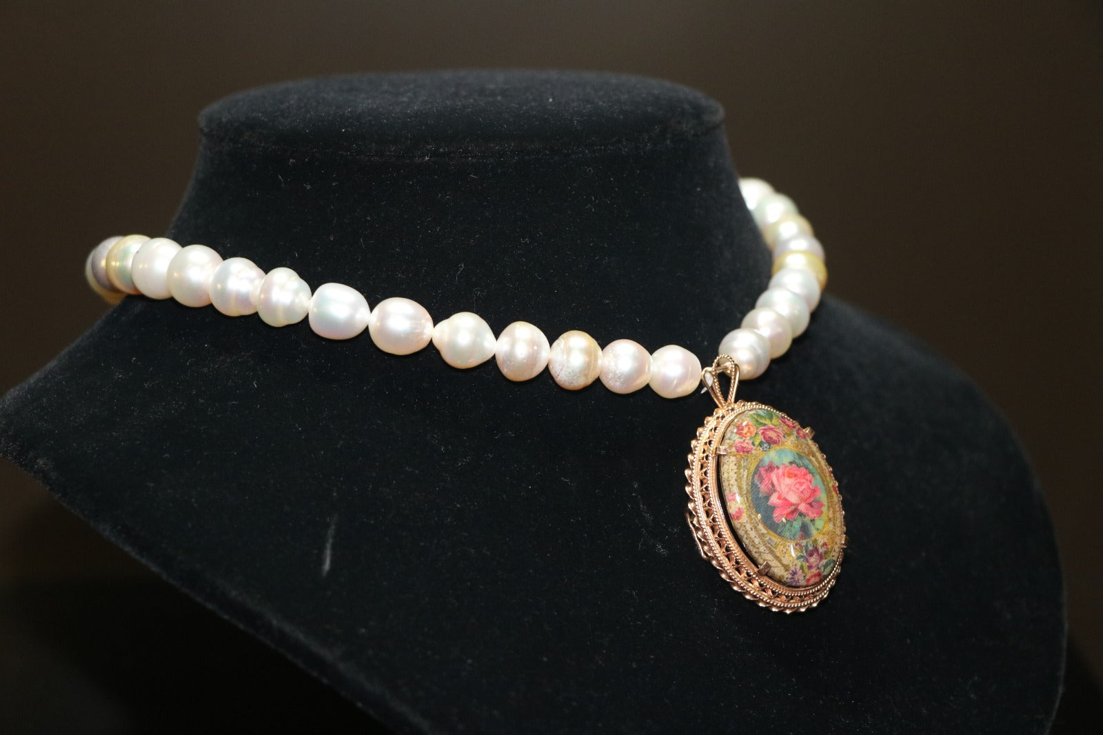 Pearl necklace with a rose gold pendant inlaid with decals (the pendant is also a brooch)