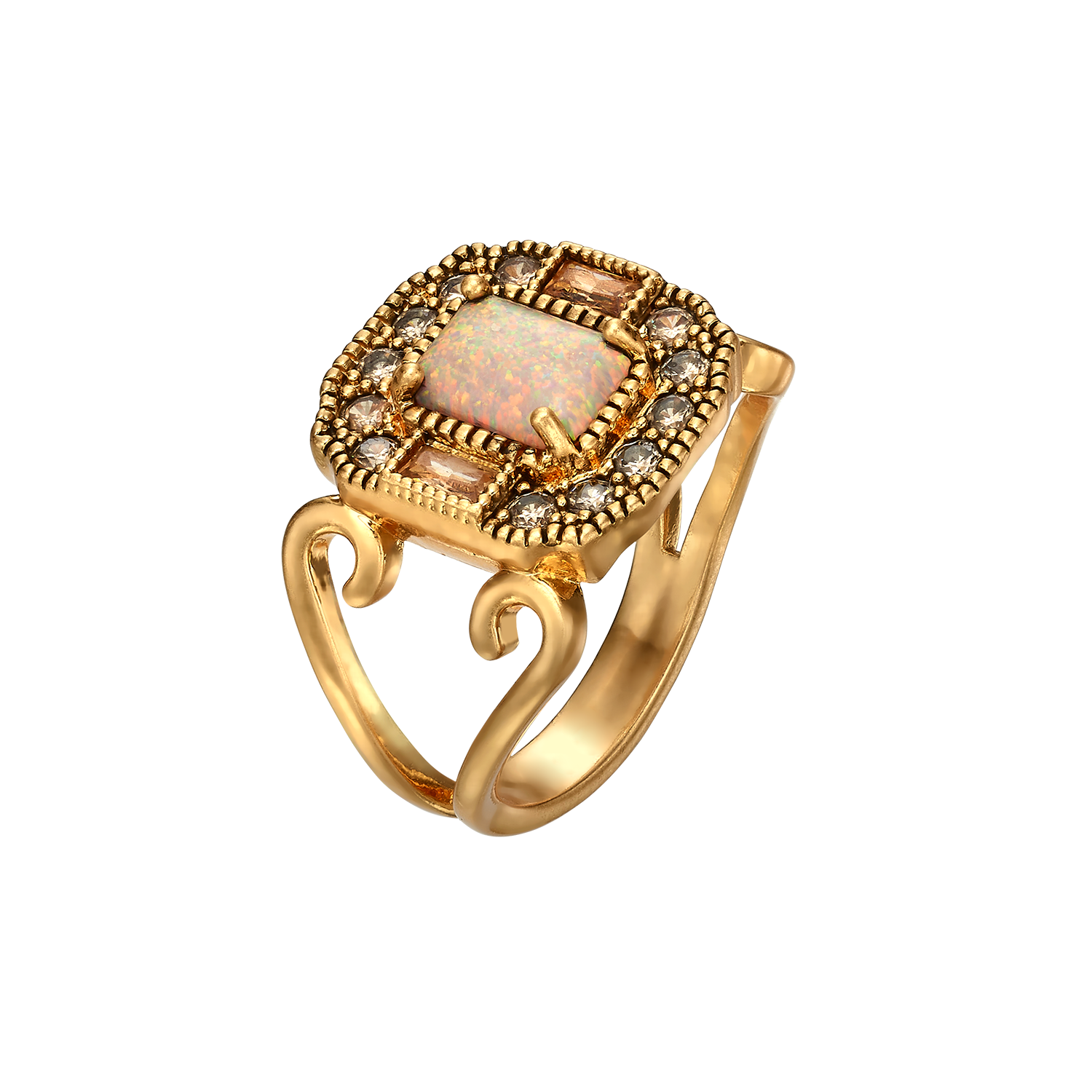 A rectangular ring in 18K gold plating, studded with brown zircon stones and greenish peridot, meticulously handmade. The ring, in a vintage jewelry style that is very much associated with Michal Negrin, is a perfect solution for a gift for a woman, a wedding anniversary gift or a birthday gift.