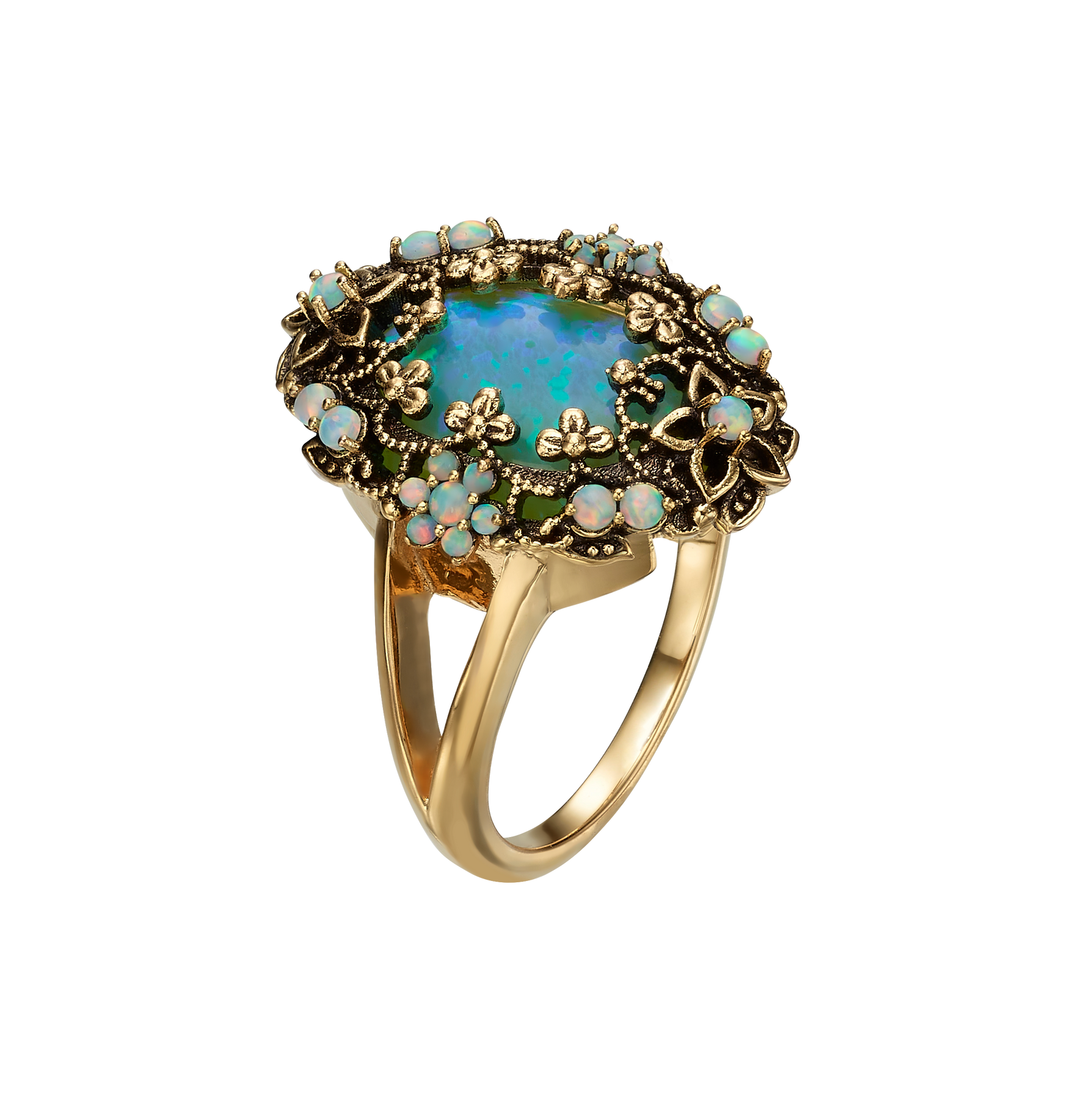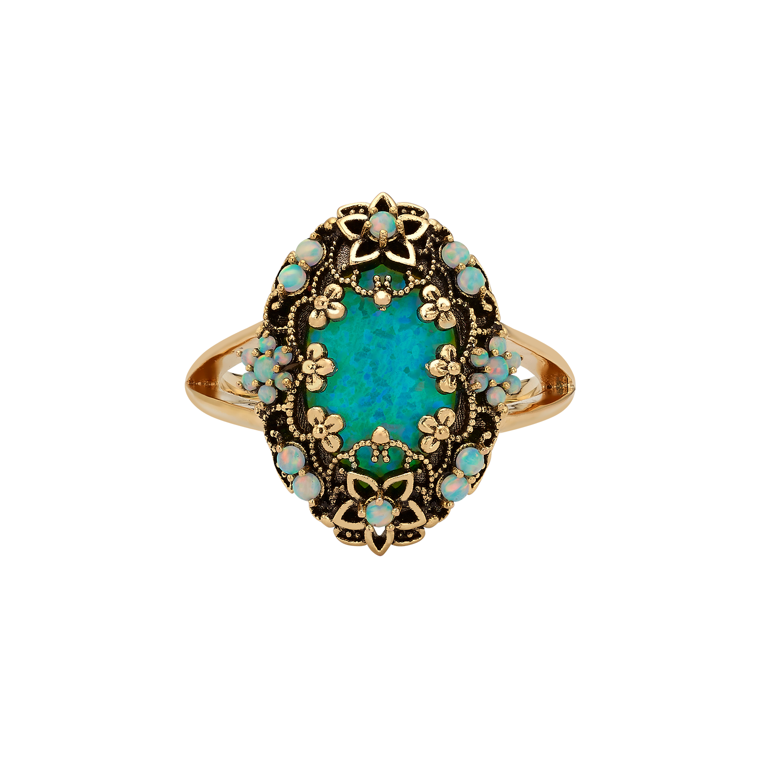 A synthetic opal ring inlaid with 18K antique gold plating. The ring was prepared through a meticulous goldsmithing process, made entirely by hand, with care for sparkle, light refraction and natural movement. The ring is the perfect solution for a birthday gift, wedding anniversary gift or Women's Day gift.