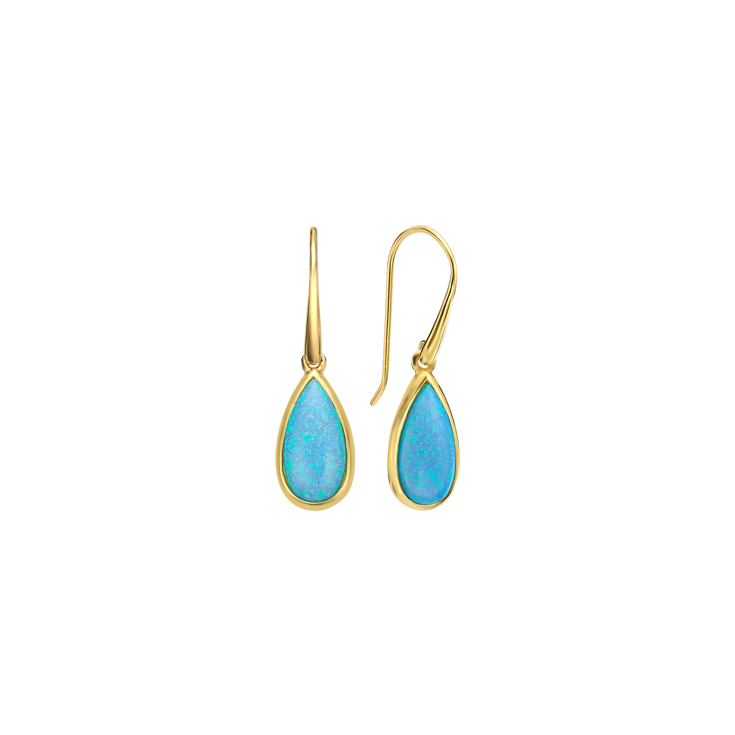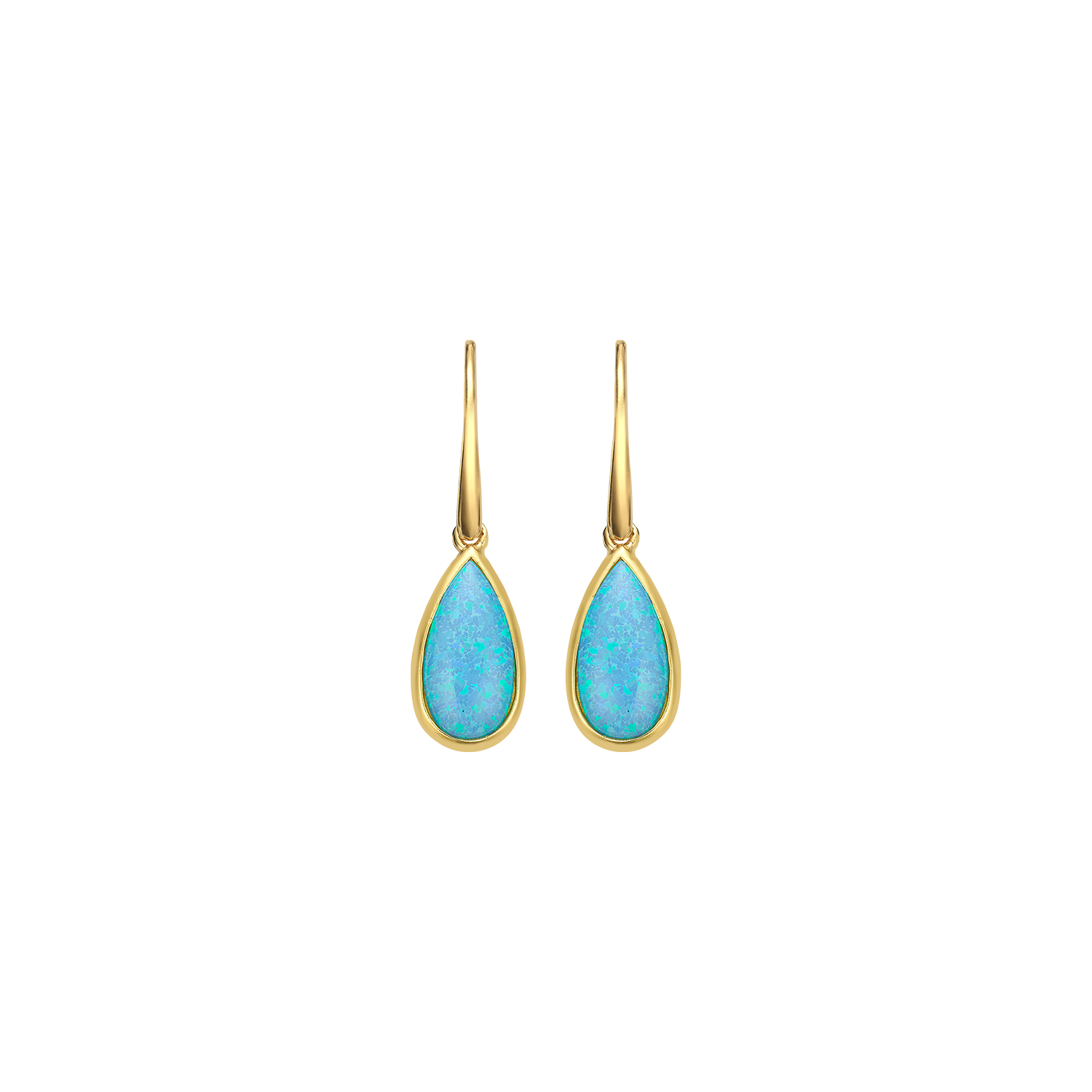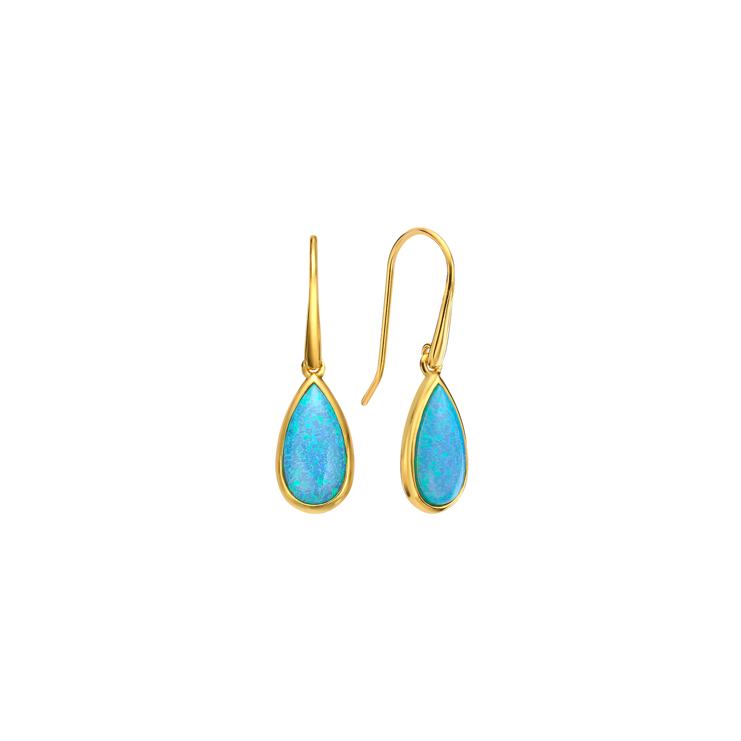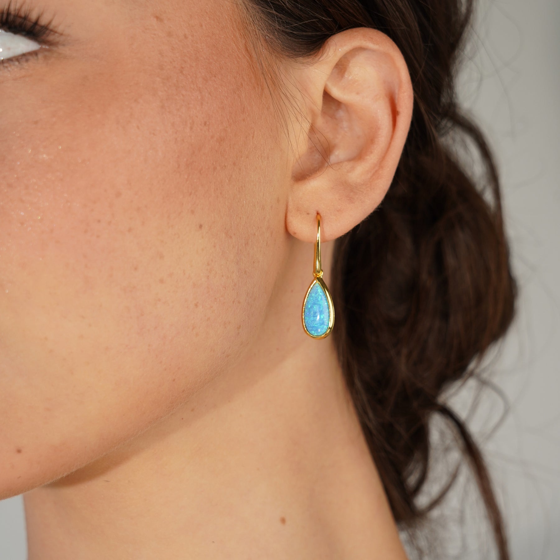 18K/24K gold-plated drop earrings, set with synthetic opal stones in a shade of light blue that changes depending on the angle at which the light falls on the stone and meticulously handcrafted. The earrings, inspired by the worlds of the sea and water, are a perfect solution for a gift for a woman, a gift for an anniversary or a birthday gift.