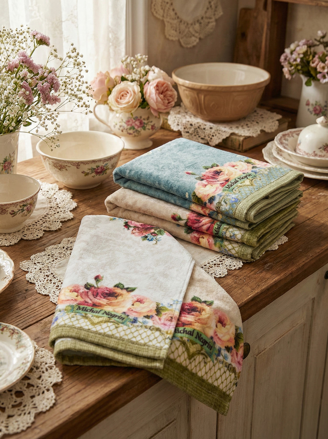 A set of two kitchen towels from designer Michal Negrin. The towels are printed with a pattern that combines roses and motifs in the designer's unique style, which is printed on the towels.
