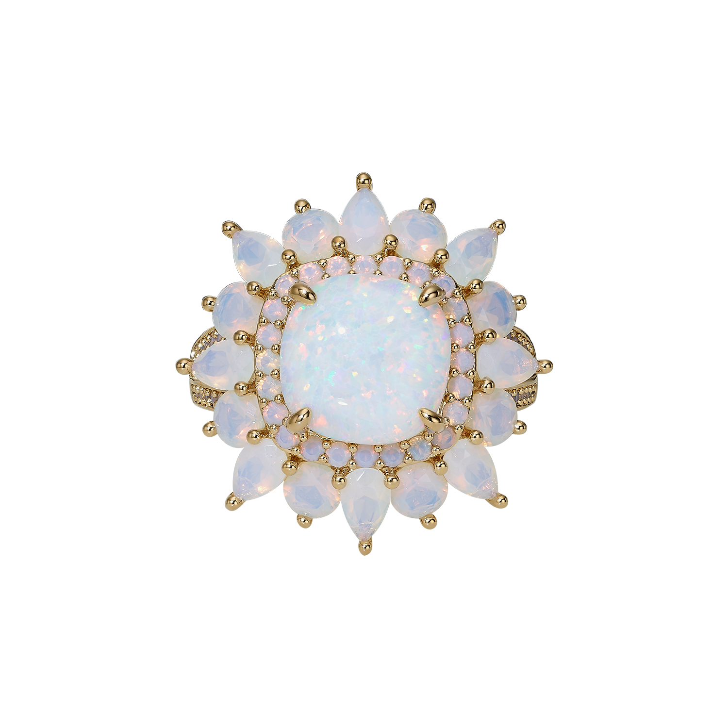 A unique flower ring in 18K gold plating, studded with synthetic opal stones, meticulously handcrafted. The unique ring, with its presence, is a perfect solution for a gift for a woman, a wedding anniversary gift or a birthday gift.