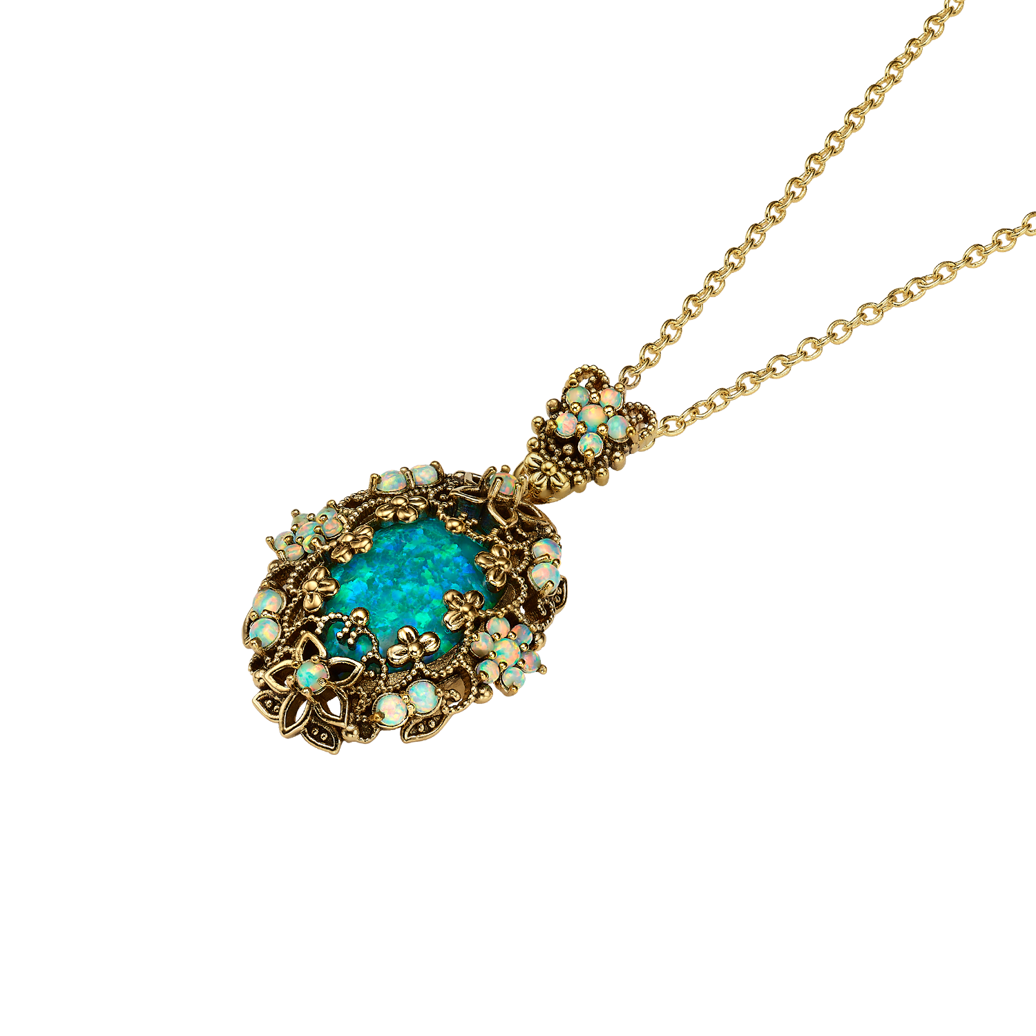 Necklace with a pendant set with synthetic opal in 18K antique gold plating. The jewelry is made entirely by hand, with meticulous goldsmithing, with attention to sparkle, light refraction and natural movement. This is the perfect solution for a birthday gift, wedding anniversary gift or Women's Day gift.