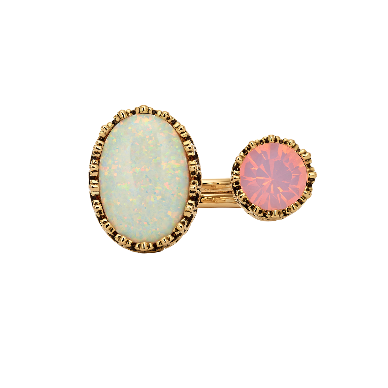 A duet ring set with a pair of oval synthetic opal stones in 18K antique gold plating. The ring was prepared through a meticulous goldsmithing process, made entirely by hand, with care for sparkle, light refraction and natural movement. The ring is the perfect solution for a birthday gift, wedding anniversary gift or Women's Day gift.