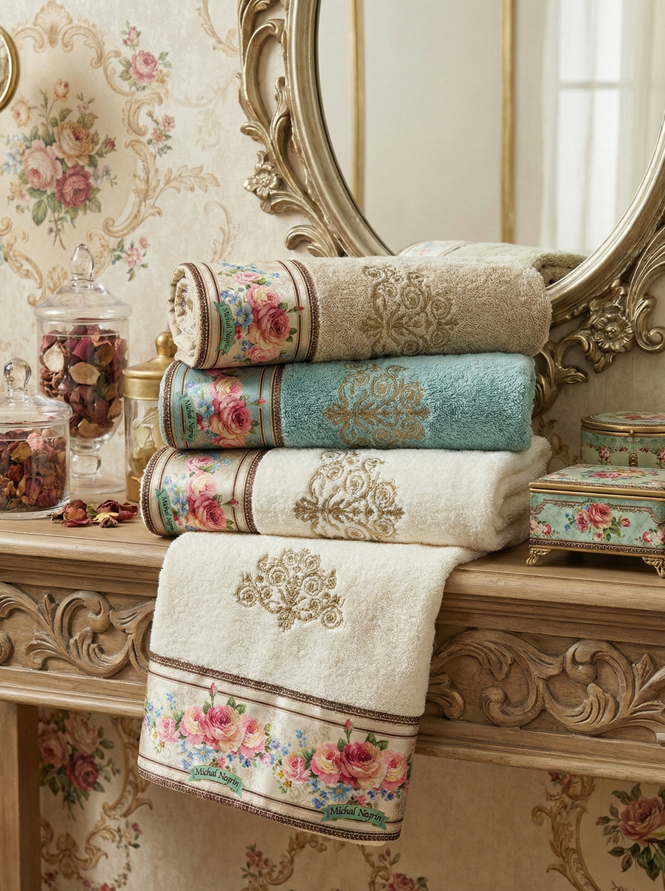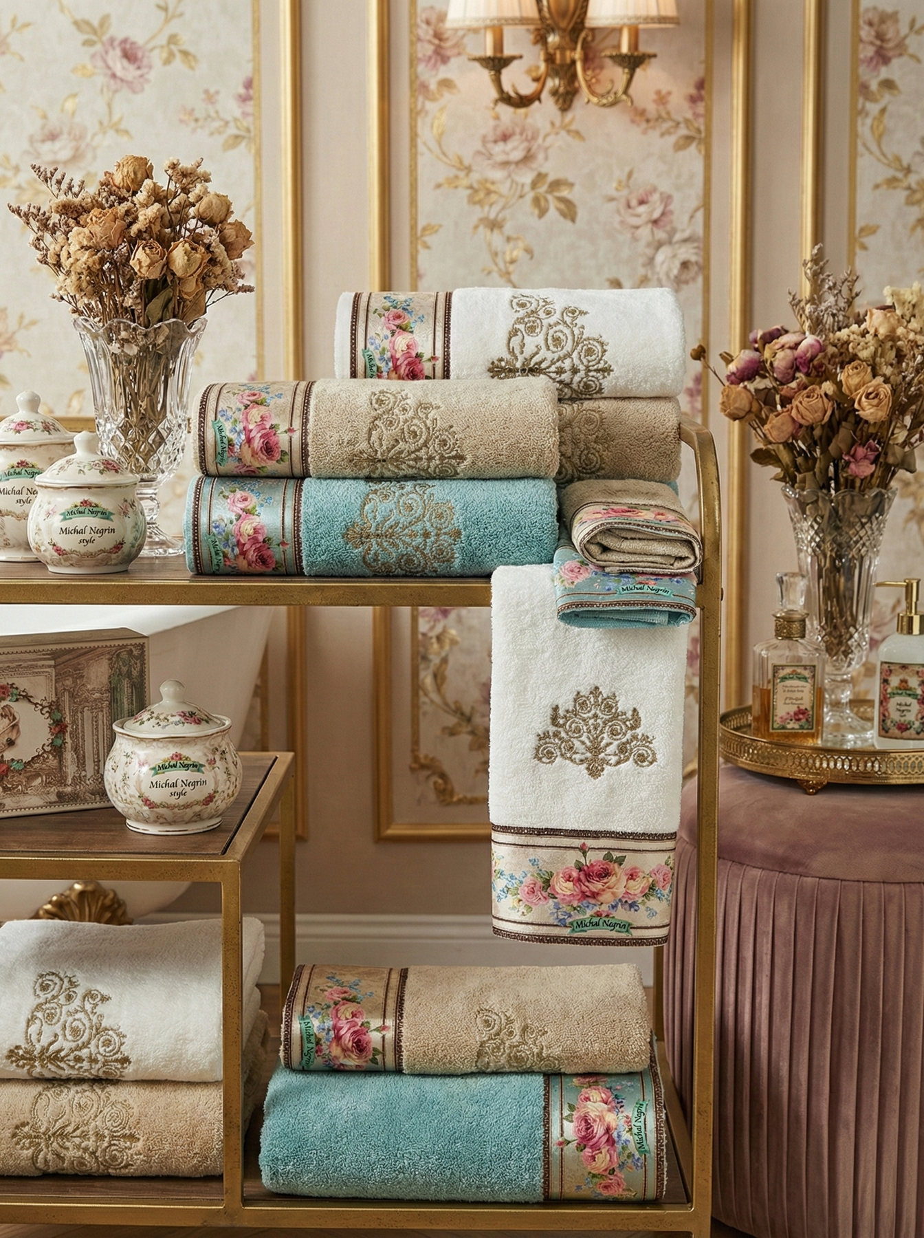 Thick and luxurious towels , designed by Michal Negrin . The towels are designed in a rich pattern that combines roses with printed lace motifs on matte satin fabric combined with rich embroidery in the designer's unique style . The design of the towels is breathtaking and the color combinations are magical , romantic and give a noble look to the towels and the bathroom . The towels are made of 100 % high-quality cotton with a soft, pleasant and caressing touch, with a high level of absorption and are especially thick and weigh approximately 600 grams per square meter .