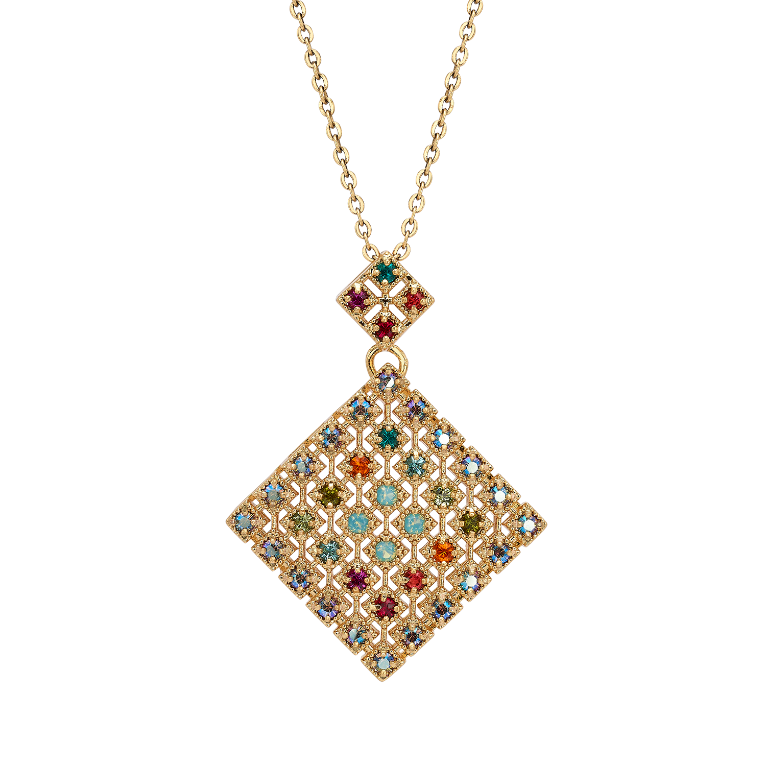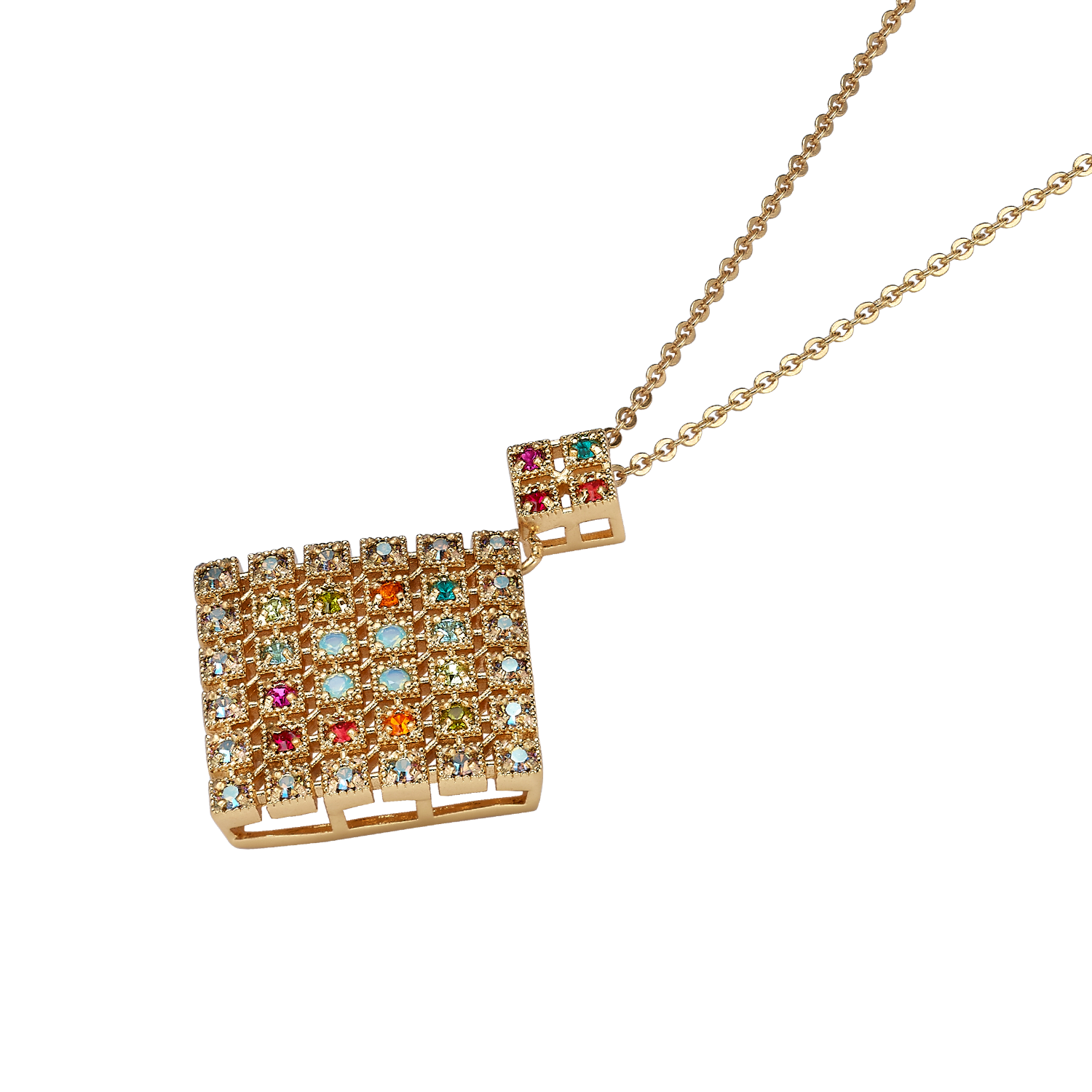 An 18K antique gold plated necklace and pendant, set with dozens of zircon stones, in a combination of colors carefully selected by Michal, meticulously handcrafted. The necklace, in the vintage jewelry style that is very much associated with Michal Negrin, is a perfect solution for a gift for a woman, a wedding anniversary gift or a birthday gift.