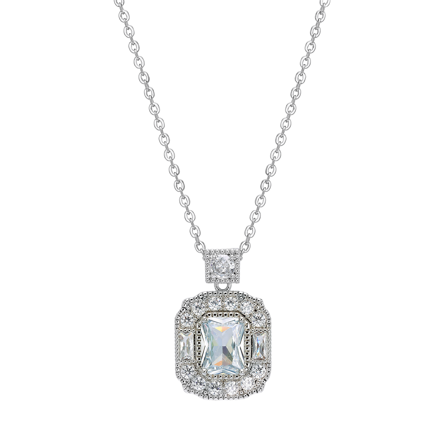 Rhodium-plated necklace and pendant, meticulously hand-stitched with transparent, rectangular-cut, luxurious zircon stones. The necklace, in a vintage jewelry style that is very much associated with Michal Negrin, is a perfect solution for a gift for a woman, a wedding anniversary gift, or a birthday gift.