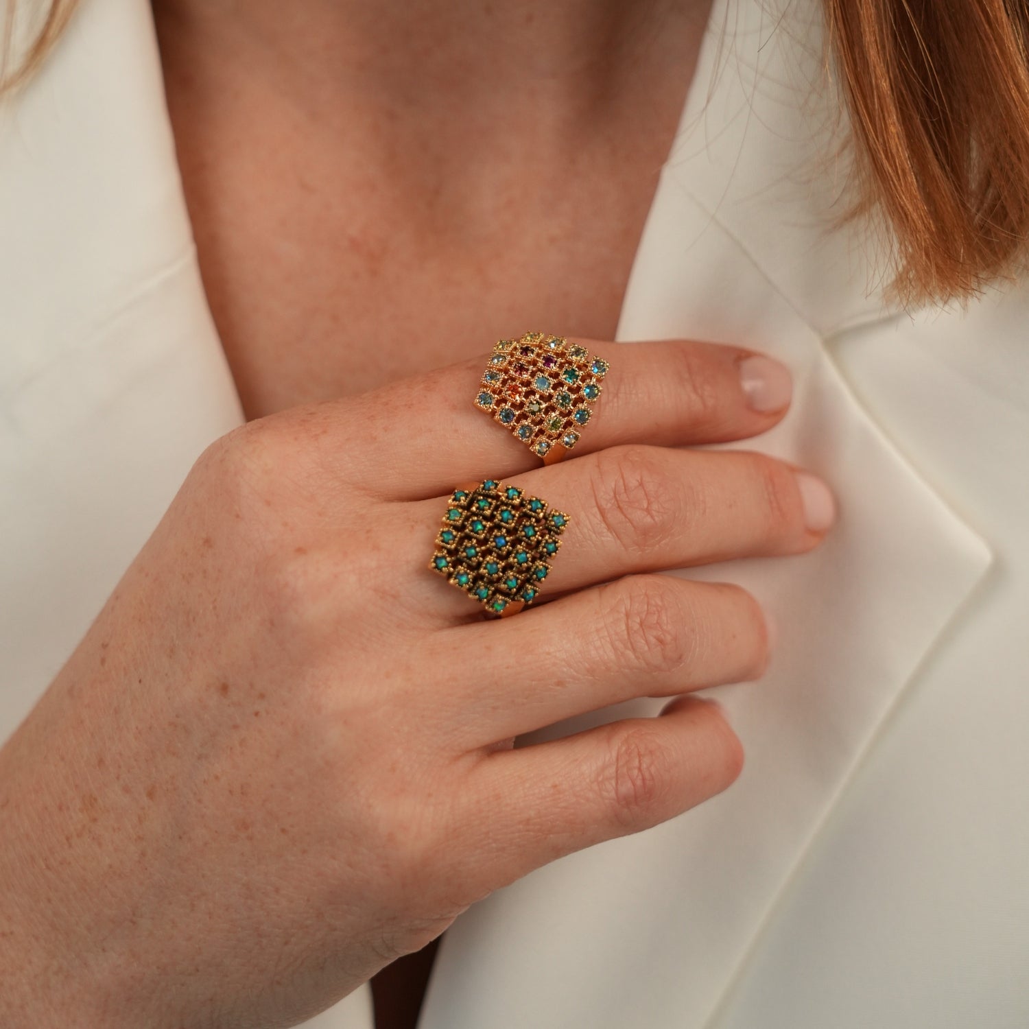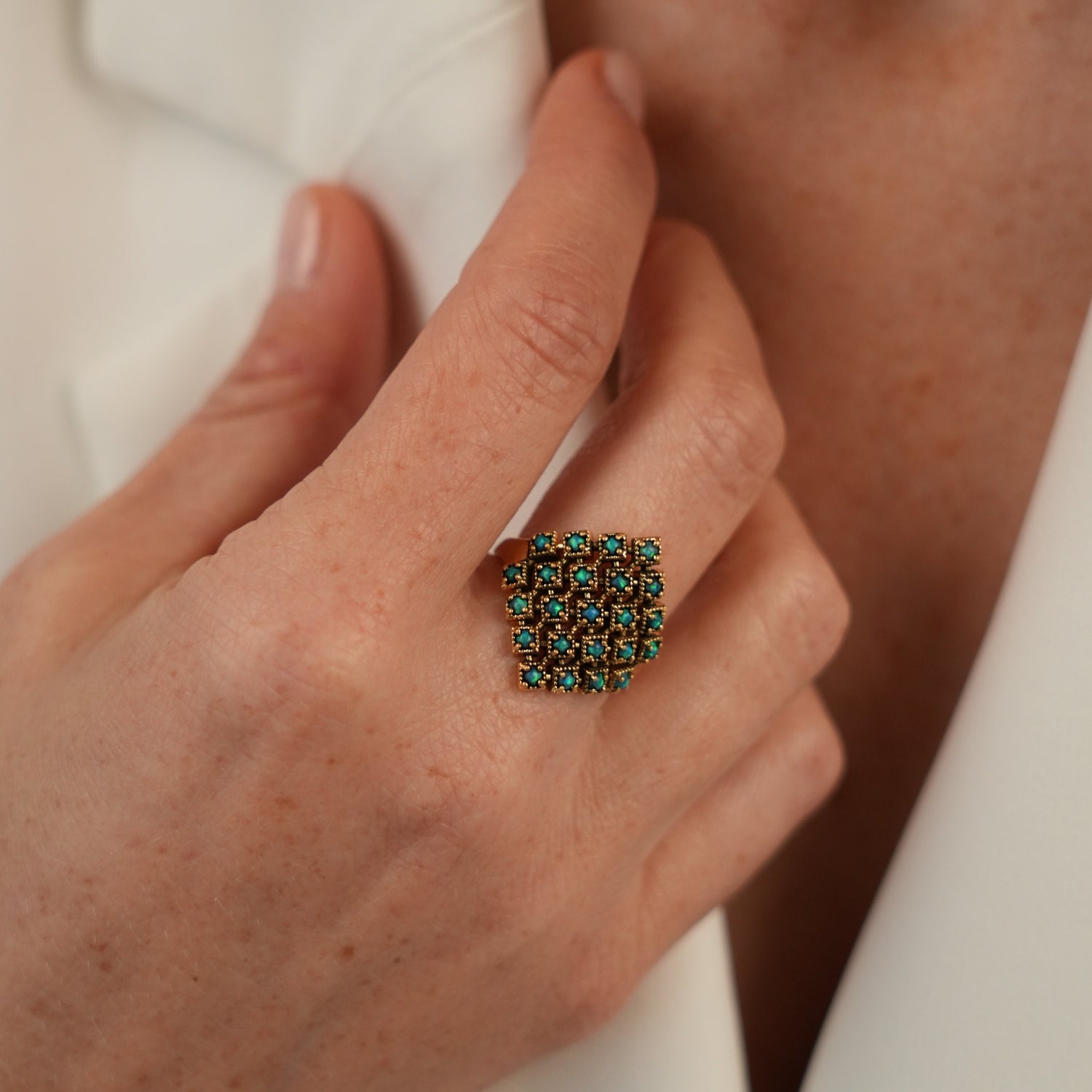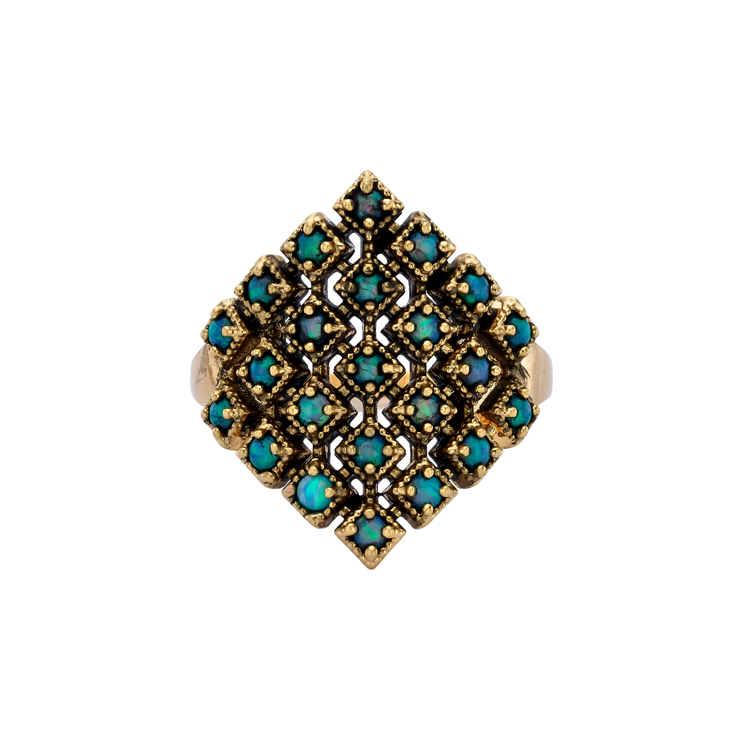 An 18K antique gold-plated ring, studded with synthetic opal stones, meticulously handcrafted. The ring, in a vintage jewelry style that is very much associated with Michal Negrin, is a perfect solution for a gift for a woman, a wedding anniversary gift, or a birthday gift.